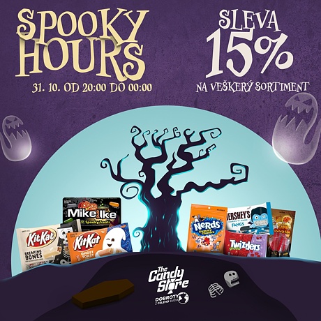 Készülj fel a Kísérteties órákra a Candy Store-ban! 🎃 Kísérteties kedvezményünk a teljes választékra október 31-én lesz a téglaüzletekben és a webáruházban. Minden fiókban 16:00 órakor kezdünk (Prága, Brno - Nové Sady és Bayerka, Ústí nad Labem, Pilsen, Liberec) és zárásig tartunk. Az online kísérteties órák 20:00 órakor kezdődnek - csak látogasson el webáruházunkba. Gyere és vadászd le a finomságokat különleges halloweeni kedvezménnyel! 👻