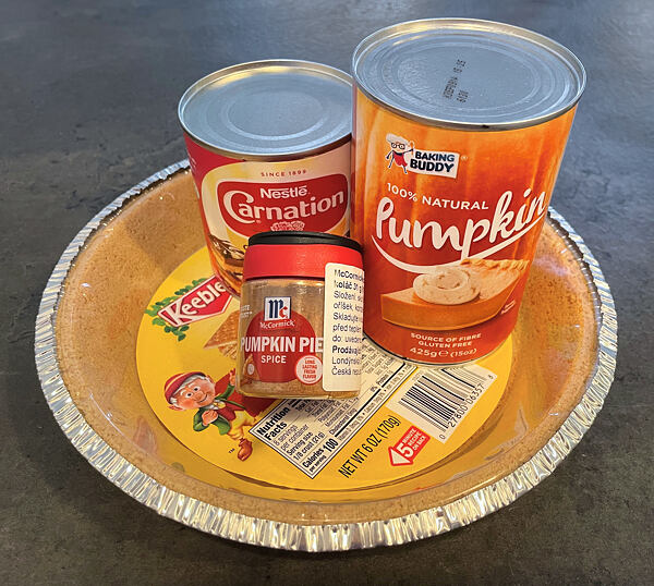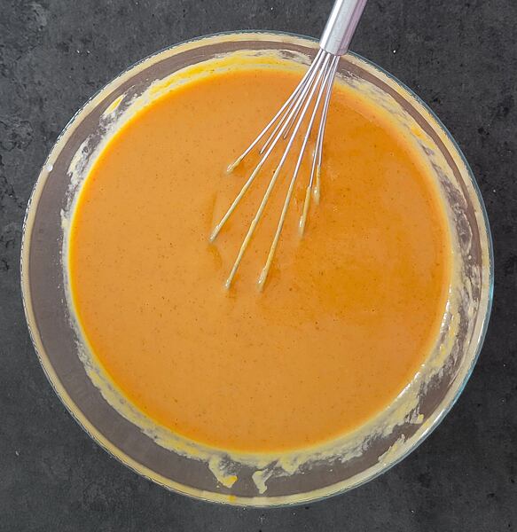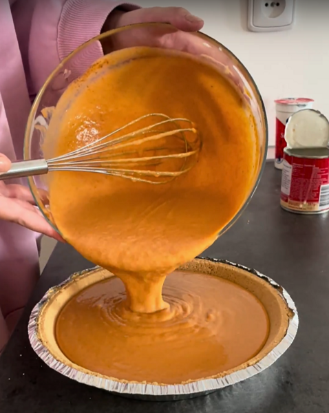 Připravte náplň: V míse smíchejte dýňové pyré, kondenzované mléko, 2 vajíčka a koření na dýňový koláč. Šlehejte, dokud nevznikne hladká směs.