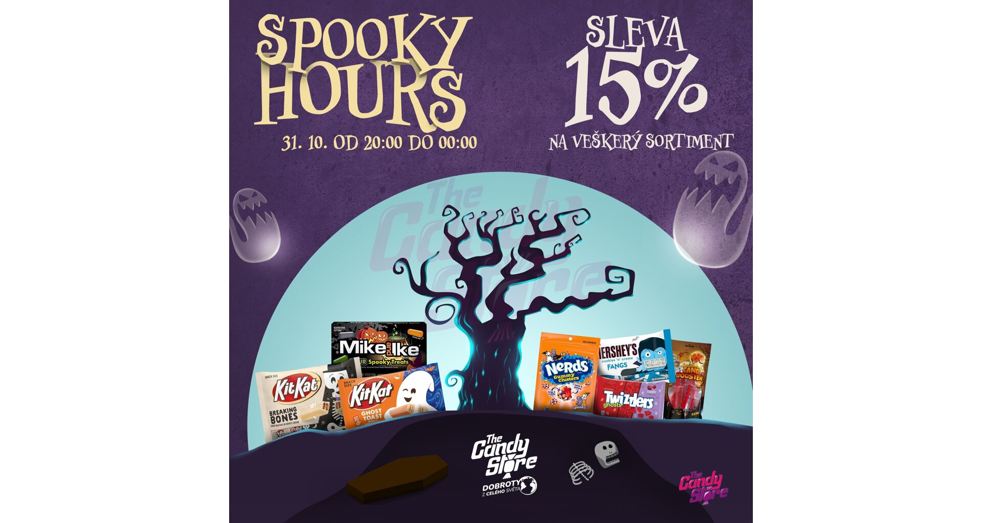 Připravte se na Spooky Hours v The Candy Store! 🎃 Naše strašidelná sleva na veškerý sortiment proběhne 31. října v kamenných prodejnách i na e-shopu. Ve všech pobočkách začínáme už v 16:00 (Praha, Brno - Nové Sady i Bayerka, Ústí nad Labem, Plzeň, Liberec) a jedeme až do zavíračky. Online Spooky Hours startují od 20:00 – stačí navštívit náš e-shop. Přijďte si ulovit dobroty za speciální halloweenskou slevičku! 👻