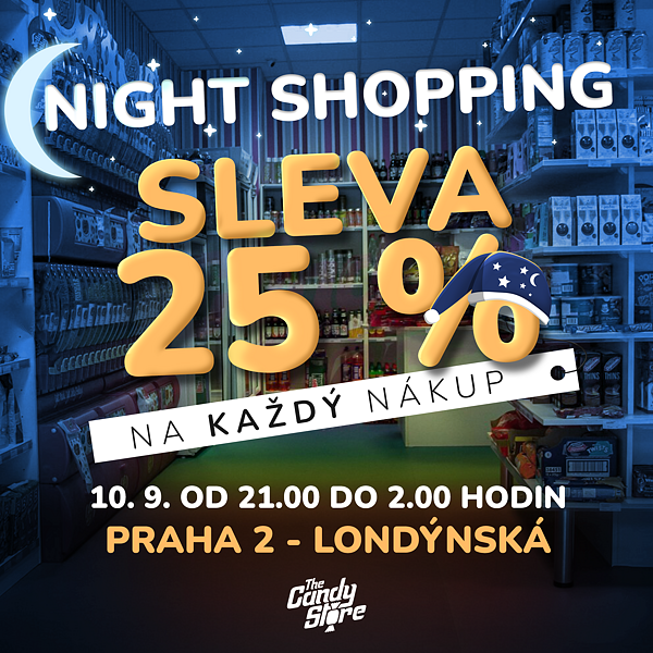 Ze soboty 10. 9. na neděli 11. 9. 2022 proběhne na naší prodejně na Praze 2 od 21.00 do 2.00 hodin akce, která v The Candy Store ještě nebyla. Jedná se o NIGHT SHOPPING! Magickou noc ✨, během které jsme si pro vás přichystali slevu 25 % na každý nákup! Přijďe to s námi roztočit na našem duhovém nákupním parketu. Vyberte si z široké nabídky dobrot z různých koutů světa. Slané i sladké. Na pečení i vaření. Ke snídani i na svačinku. Světové dobroty pro děti i dospělé. U nás si zkrátka každý přijde na své. 💛
