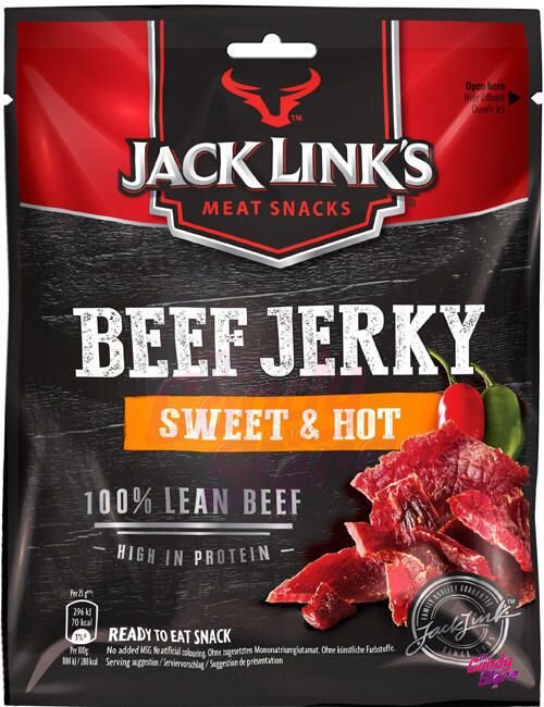 Hovězí maso, cukr, mořská sůl, extrakt z droždí, česnekový prášek, koření (obsahuje celer), konzervační sůl (sůl, konzervační látka: dusitan sodný), příchutě, cibulový prášek, antioxidant: extrakt z rozmarýnu, regulátor kyselosti: kyselina citronová, ananasový prášek. 100 g beef jerky je vyrobeno z 182 g prémiového hovězího masa.