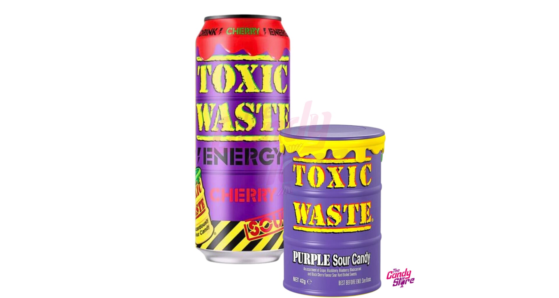 Vyzkoušejte náš super kyselý DUO Pack, který se skládá z Toxic Waste energetického nápoje s příchutí třešně a Toxic Waste Purple kyselých bonbonků.