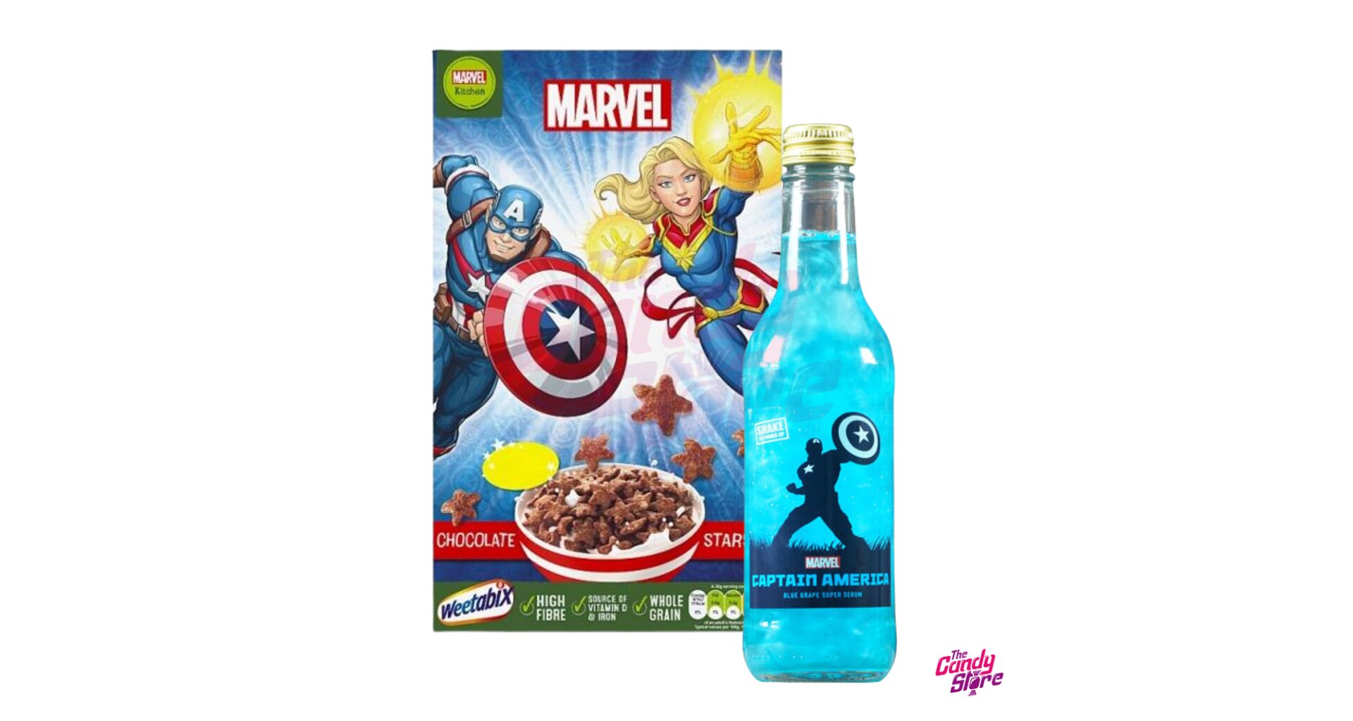 Weetabix Marvel cereálie 500 g + Marvel Captain America třpytivý nápoj s hroznovou příchutí 330 ml